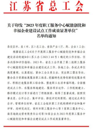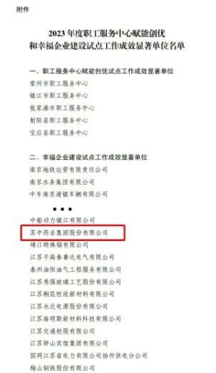 近日,江蘇省總工會正式發(fā)布2023年度職工服務(wù)中心賦能創(chuàng)優(yōu)和幸福企業(yè)建設(shè)試點工作成效顯著單位名單,蘇中藥業(yè)集團股份有限公司獲評江蘇省幸福企業(yè)建設(shè)試點工作成效顯著單位。