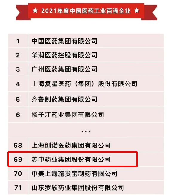 12月18日,由中國醫(yī)藥工業(yè)信息中心主辦的2022(第39屆)全國醫(yī)藥工業(yè)信息年會上,“2021年度中國醫(yī)藥工業(yè)百強榜”正式發(fā)布,蘇中藥業(yè)集團股份有限公司榮登第69位,這已是蘇中藥業(yè)連續(xù)17年躋身中國醫(yī)藥工業(yè)百強榜。