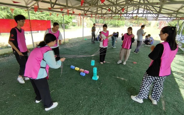 在兩位教練的引導(dǎo)下,大家通過(guò)兩輪游戲進(jìn)行分組,就此葫蘆戰(zhàn)隊(duì)、清宣隊(duì)、猛虎隊(duì)正式開(kāi)啟今日的拓展之旅!首先迎接的挑戰(zhàn)叫做步步高升。隊(duì)員需要協(xié)同合作,利用繩子之間的牽引力來(lái)共同控制積木的拾取、移動(dòng)方向和升降,使積木能夠垂直疊加在一起,以層級(jí)堆疊高度獲勝,很是考驗(yàn)隊(duì)員之間協(xié)同執(zhí)行力和溝通能力,正所謂“力出一孔”。清宣隊(duì)通過(guò)對(duì)猛虎隊(duì)的觀察與學(xué)習(xí),并且在比賽過(guò)程中時(shí)刻保持求穩(wěn)的心態(tài),最終獲得了本輪游戲的勝利。這個(gè)游戲讓大家體會(huì)到了學(xué)習(xí)和務(wù)實(shí)的重要性。
