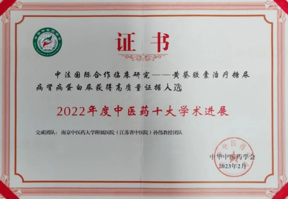 2月25日,由中華中醫(yī)藥學(xué)會主辦的2022年度中醫(yī)藥十大學(xué)術(shù)進(jìn)展發(fā)布會在北京召開。大會宣布了2022年度中醫(yī)藥十大學(xué)術(shù)進(jìn)展,《中法國際合作臨床研究——黃葵膠囊治療糖尿病腎病蛋白尿獲得高質(zhì)量證據(jù)》列為本次十大進(jìn)展第二項(xiàng)。
