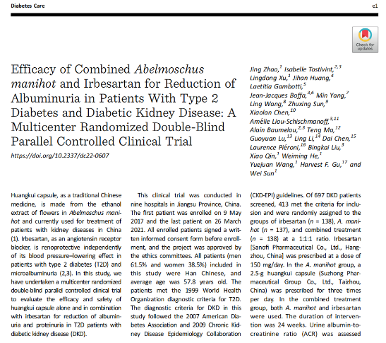 相關(guān)研究結(jié)果于2022年5月在《diabetes care》發(fā)表,是近20余年來我國中醫(yī)腎病學(xué)專家首次在該雜志上刊登研究成果。該研究不僅為DKD蛋白尿患者的治療提供了新方案,更為中醫(yī)藥研究國際化提供了新的模式,推進(jìn)了中醫(yī)藥走出國門。